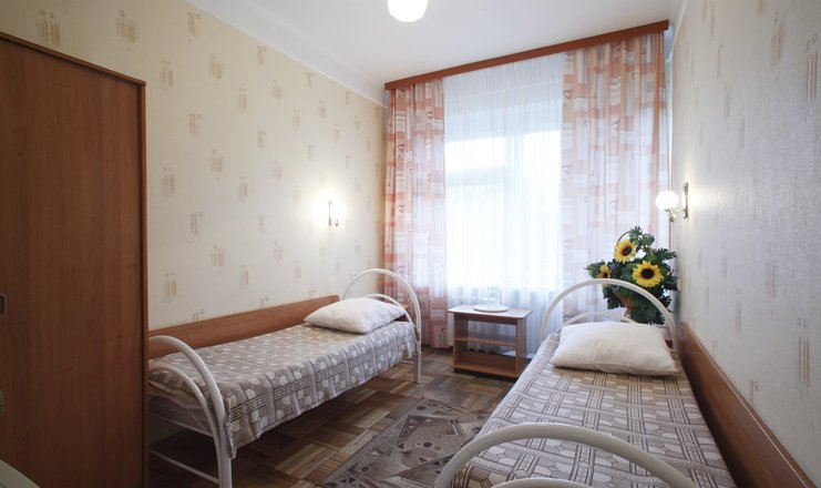 В номере: кровати односпальные, прикроватные тумбочки, стол, стул, шкаф, телевизор, холодильник