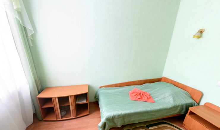 В номере: мини-холодильник, одна полуторная кровать, стол, стул, телевизор, тумбочка, электрочайник, набор посуды, зеркало, вешалка
