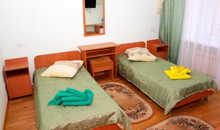 В номере: вешалка, зеркало, кровати односпальные, прикроватные тумбочки, стол, стулья, шкаф встроенный, мини-холодильник, набор посуды, телевизор