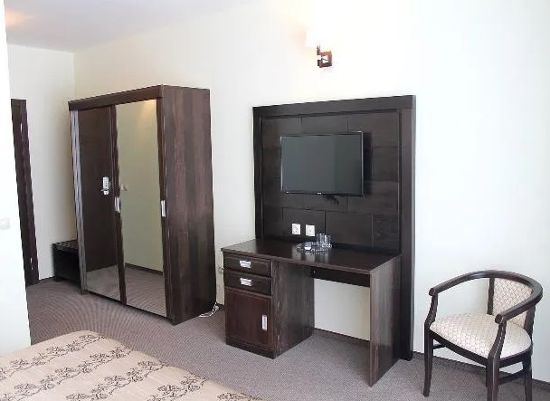 В номере: багажная тумба, зеркало, двуспальная кровать, тумбы, стулья, шкаф-купе, телевизор, светильник, электронные замки, Wi-Fi, телефон